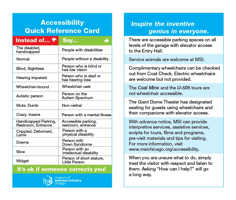 There is a lot of small details that go into making sure something is accessible. I have created reference posters/cards to help my team stay as accessible as possible. The Accessibility Quick Reference Cards fit in the back of the MSI ID holders for easy access for all employees.